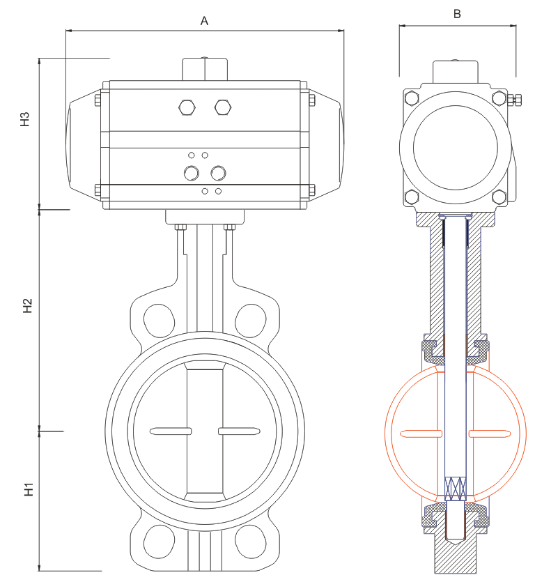 大口徑閥門采用系列AW型氣動執(zhí)行器拔叉式傳動,結(jié)構(gòu)合理,輸出扭矩大,有雙作用式和單作用式